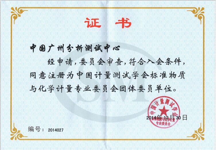 中广测正式注册成为中国计量测试学会标准物质与化学计量专业委员会团体委员单位,注册编号:2014027。