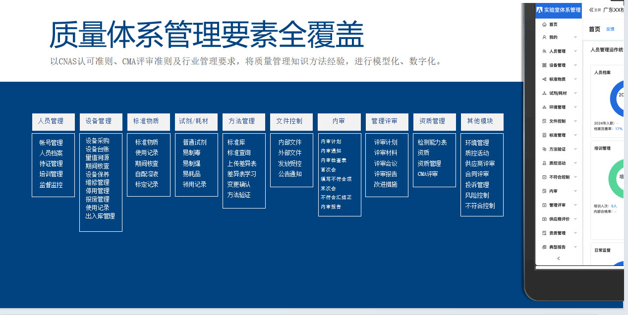双合实验室质量体系管理系统由资深评审专家团指导,以CNAS认可准则和 CMA评审准则为基本依据,聚焦质量管理与生产脱节、任务布置有去无回、资料难归档易丢失等实验室质量管理的8大痛点,为实验室一线人员减负,打造实验室体系管理要素全覆盖的共享技术质量负责人,提升质量体系管理水平和运行效率,助力实验室行稳“质”远。