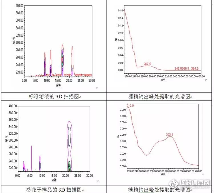 对比样品、标准溶液的3D扫描图以及对应时间提取到的光谱图很明显可以发现,五香瓜子样品中糖精钠3D扫描图和光谱图与标准溶液的很相似,而葵花子3D扫描图和光谱图中出现了两个较大的吸收波长,吸收波长与糖精钠的吸收波长不一致,其提取到的光谱图与前两者明显不同,表明葵花子样品中糖精钠出峰处有干扰物质存在,进一步证实了前面的怀疑。