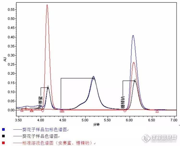 葵花子样品中加入一定含量的糖精钠标准溶液,然后按照上诉方法样品前处理和色谱分析,进行加标验证,验证结果如下图。