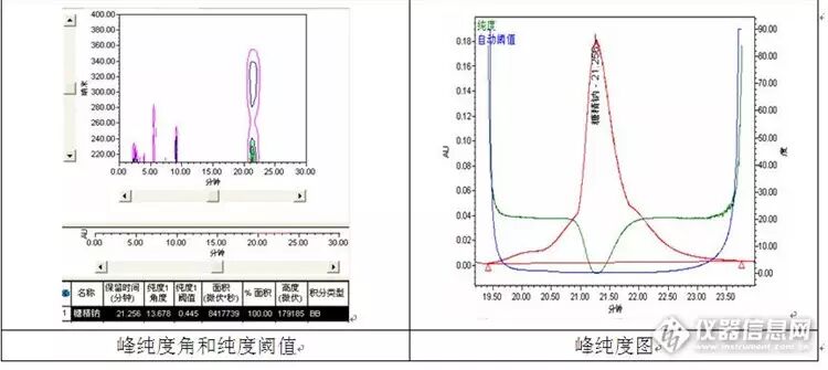 在对峰纯度分析中也可以看到,糖精钠的“纯度角度”远大于“纯度阈值”。